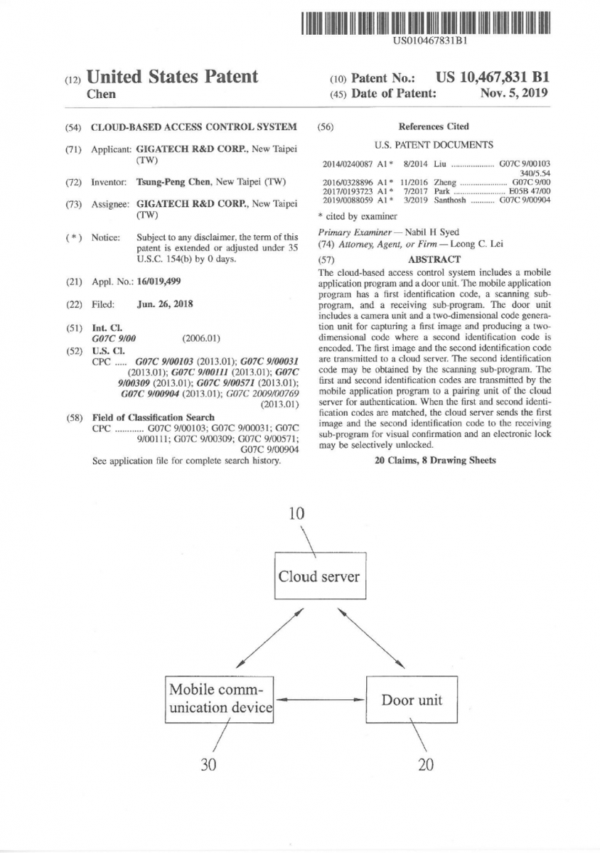 積佳的雲對講與APP門禁管理技術領先業界, 繼台灣新發明專利之後取得了美國的新發明專利.